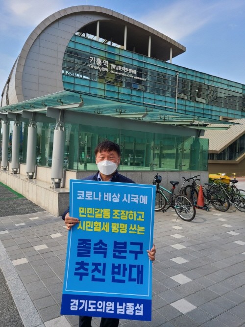 6일 오후 기흥역에서 1인 시위를 한 남종섭 위원장은 ‘코로나 비상 시국에 민민갈등 조장하고, 시민혈세 펑펑 쓰는 졸속 분구 추진 반대’가 적힌 팻말을 놓고, 지금 용인시가 제대로 된 주민 공론화 없이 주민에게 분구의 장점만을 열거해 설문조사를 실시하여 민민갈등 만을 유발하고 있다며, 코로나19로 시민은 힘든데 한가하게 공무원 조직 늘리기에만 용인시가 열중하고 있다고 지적했다.
