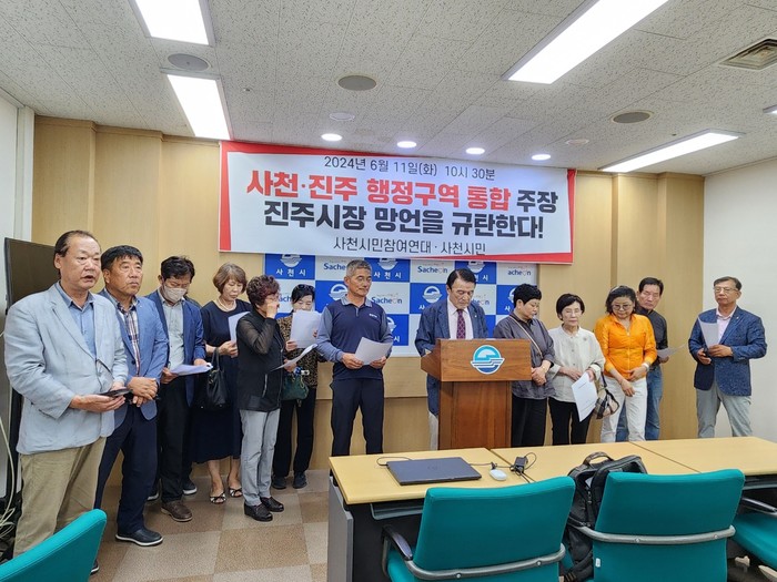 이들은 이날 오전 10시 30분 사천시청 브리핑룸에서 기자회견을 갖고 “사천시와 진주시 통합은 주민자치 근간을 훼손하는 풀뿌리 민주주의에 배치되는 행위로 주민들의 행정 자치참여 기회를 박탈하는 독선적인 비민주적 행태다.”며 “진주시장의 행정구역 통합주장은 지역주민들의 갈등을 조장하는 망언이고, 지방행정 수장으로서 용납할 수 없는 매우 부적절한 행위로 이를 개탄하면서 철회할 것을 촉구한다.”고 말했다.