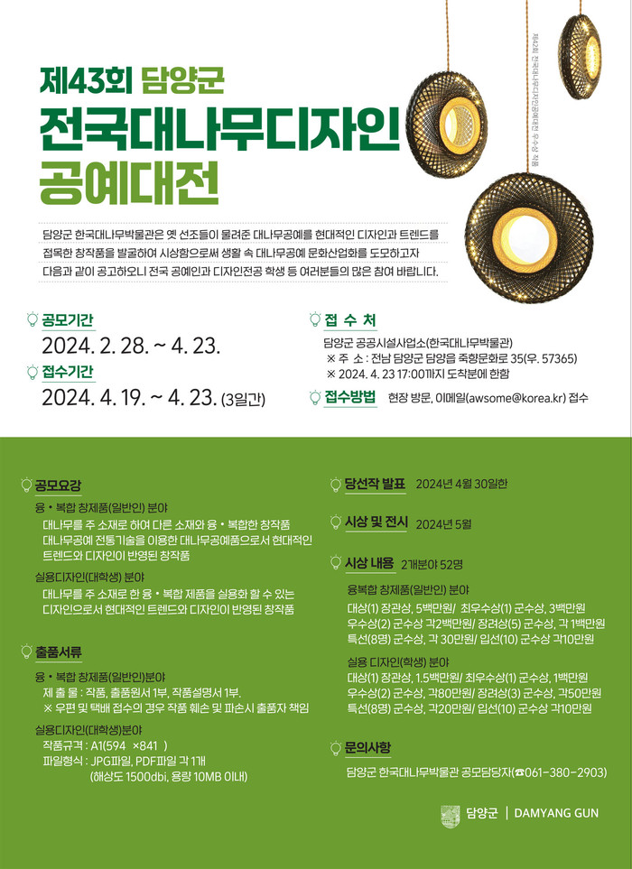 자세한 사항은 담양군 공공시설사업소 한국대나무박물관팀(☎061-380-2903)으로 문의하면 된다.