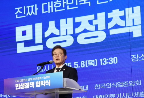▲이재명 더불어민주당 대통령 후보가 8일 오후 서울 영등포구 중소기업중앙회에서 열린 선거대책위원회 직능본부 민생정책 협약식에서 인사말을 하고 있다.(사진= 뉴스1) |