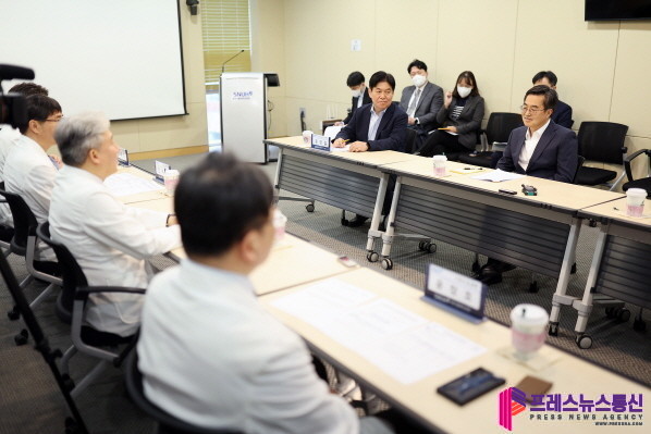 | ▲28일 오전 김동연 경기도지사가 송정한 분당서울대병원장 및 관계자 등에게 병원 운영현황 브리핑 및 건의사항을 청취하고 있다.(사진=경기도) |