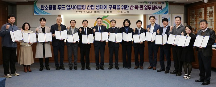 나주시(시장 윤병태)는 지난 14일 시청사 이화실에서 푸드테크 분야 15곳의 연구기관, 기업, 대학 등과 ‘탄소중립 푸드 업사이클링 산업 생태계 구축을 위한 업무협약을 체결했다고 16일 밝혔다.