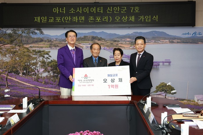 [전남=프레스뉴스] 강래성 기자= 신안군(군수 박우량)은 지난 12일 성금 1억 원을 기부한 재일교포 오상채 씨의 신안군 7호 아너 소사이어티 가입식을 가졌다고 밝혔다.