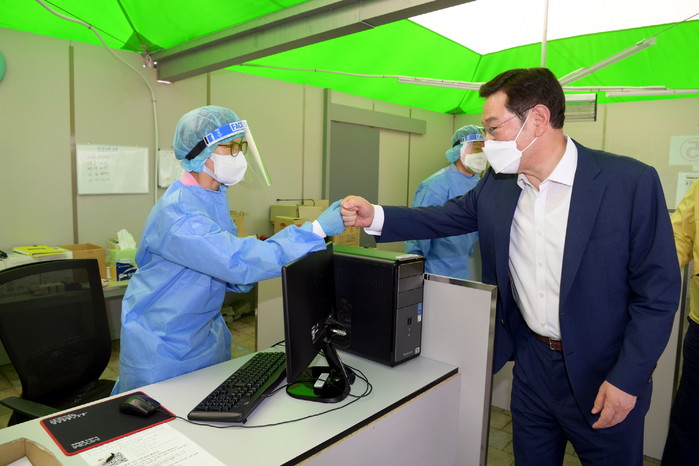 이용섭 시장은 31일 시청 야외음악당 임시선별검사소를 둘러보고 의료진, 자원봉사자들의 노고를 격려했다.