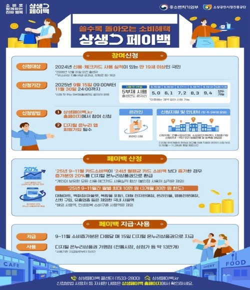 신청 대상은 지난해 본인 명의의 국내 신용·체크카드 사의 카드로 소비한 실적이 있는 만 19세 이상의 국민과 외국인으 다음 달 15일부터 11월 30일까지 상생페이백 누리집(상생페이백.kr)에서 신청할 수 있다.