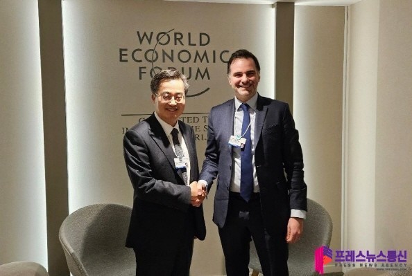 | ▲21일 오후(현지시간) 김동연 경기도지사가 스위스 다보스 콩그레스 센터에서 로랑 생 마르뗑 프랑스 통상부장관 면담을 하고 있다.(사진=경기도) |