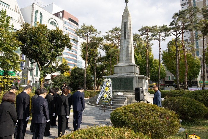 | ▲광주시교육청, 광주학생독립운동 기념탑(비) 참배(광주일고)/광주시교육청 제공 |