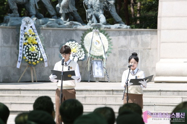 ▲6일 안양시 만안구 안양동 현충탑에서 열린 현충일 추념식에서 인덕원고등학교 학생들이 추모 헌시를 낭독하고 있다.(사진=안양시) |