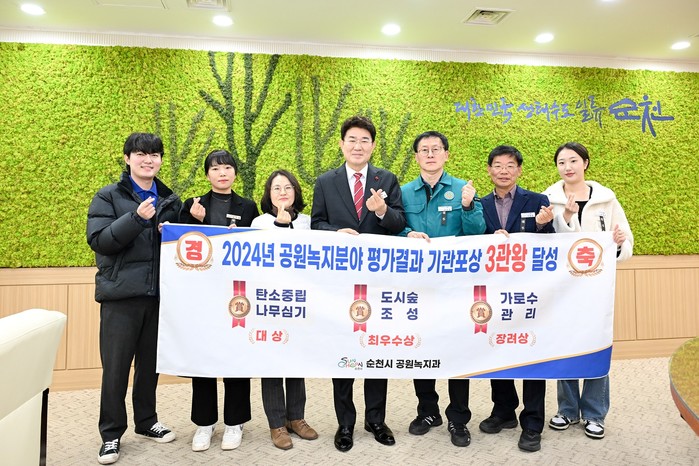 [전남=프레스뉴스] 강래성 기자= 순천시(시장 노관규)는 「2024년 전라남도 주관 도시숲 등 우수사례 평가」에서 도시숲 조성 부문 “최우수상”과 가로수 조성관리 부문 “장려상”을 수상한 데 이어, 최근 탄소중립 나무심기 평가에서 “대상”을 수상하며 3관왕의 영예를 안았다.