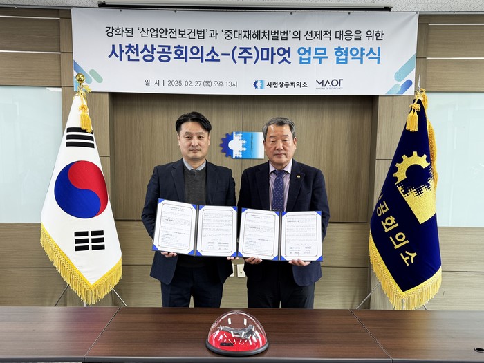 | ▲사천상공회의소(회장 황태부)는 지난 27일 ㈜마엇과 ′디지털 위험성평가 시스템′ 구축지원 업무협약을 체결했다고 28일 밝혔다. (사진=사천상공회의소) |