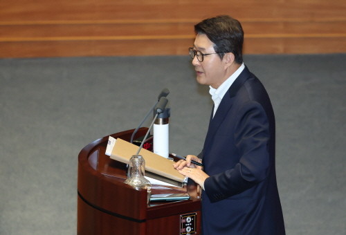 이날 문진석 민주당 원내수석부대표는 의사일정 변경 동의안 제안 설명에 나서 "방송 3법, 노조법 등 민생 개혁 입법 5건에 대해 국민의힘의 이유 없는 발목 잡기와 입법 방해를 위한 조치"라며 "국민의힘은 논의 시간이 부족하다고 주장하고 있지만 사실이 아니다. 이들 법안은 윤석열 정부의 거부권 남발로 21대, 22대를 걸쳐 재발의를 반복해왔고 그 과정에서 여야 간 치열한 논쟁과 심의가 있었다"고 했다.