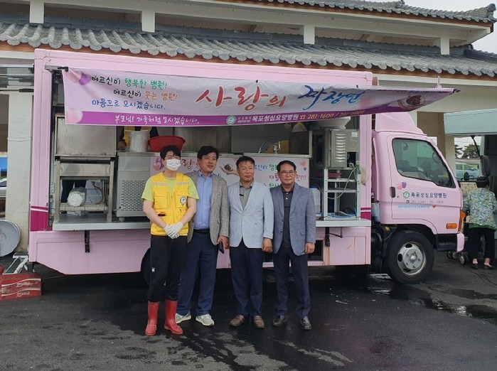 [전남=프레스뉴스] 강래성 기자= 의료법인새한의료재단 목포성심요양병원(이사장 구경자)은 무안군 사회복지 협의회(회장 나민희)와 함께 지난 24일 푸드트럭 2대를 이용 망운면 어르신 100여 명에게 짜장면과 음료 나눔 봉사활동을 실시하였다.