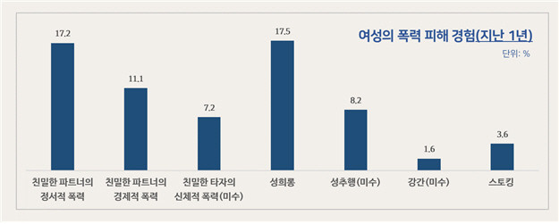 최근 1년(2021년 9월~2022년 8월)간 피해 경험을 조사한 결과, ▲성희롱 17.5% ▲정서적 폭력(정서적 학대와 통제 행동 등) 17.2% ▲경제적 폭력(금전적 재원 등의 이용을 막는 것) 11.1% ▲성추행(미수 포함) 8.2% ▲신체적 폭력(때리기, 무기로 위협 등) 7.2% ▲스토킹 3.6% ▲강간(미수 포함) 1.6% 순으로 나타났다. 정서적 폭력, 경제적 폭력, 신체적 폭력은 ‘친밀한 파트너’가 피해를 입혔는지로 물어봤다. 유엔 여성폭력통계 가이드라인에서 말하는 ‘친밀한 파트너’란 배우자, 전 배우자, 연인, 전 연인, 사실혼 관계 등이다.