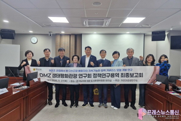 [프레스뉴스] 류현주 기자= 경기도의회 의원연구단체인 DMZ생태평화관광 연구회(회장 오준환 의원)는 지난 27일(목) 경기도의회 도시환경위원회 회의실에서 「커먼즈 관점에서 본 DMZ와 배후지의 지속가능한 협력 거버넌스 모델 개발 연구」 용역 최종보고회를 개최했다.