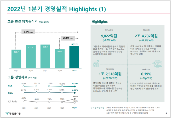 [프레스뉴스] 김대일 기자= 하나금융그룹(회장 함영주, www.hanafn.com)은 2022년 1분기에 9,022억원의 연결당기순이익을 시현했다고 밝혔다.