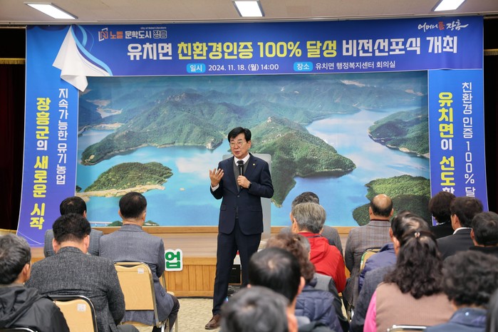 [전남=프레스뉴스] 강래성 기자= 장흥군은 18일 유치면 행정복지센터에서 ‘친환경 인증 100% 달성 비전 선포식’을 개최했다.