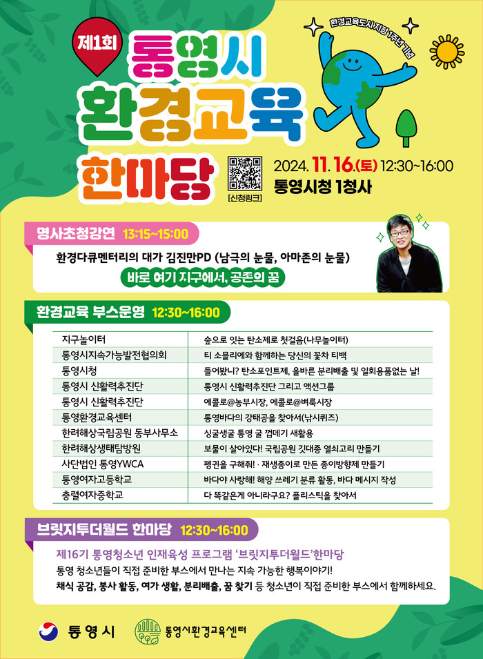 당일 오후 12시 30분부터 16시까지 지구놀이터, 한려해상생태탐방원, 충렬여자중학교 등 총 11개 기관에서 환경 관련 체험부스를 운영할 계획이다. 특히 13시 15분부터 통영시청 제1청사 강당에서는 북극의 눈물, 남극의 눈물, 아마존의 눈물을 제작한 환경다큐멘터리의 대가 김진만 PD를 초청해 「바로 여기 지구에서, 공존의 꿈」이라는 주제로 명사초청 강연을 개최한다.
