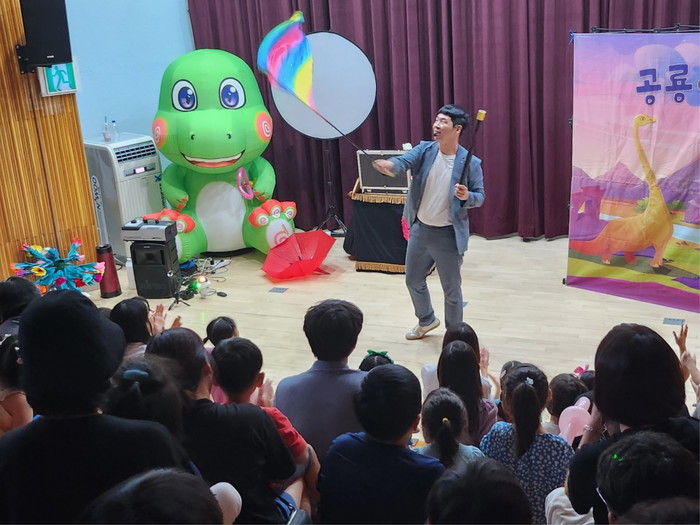 도서관은 올해 ‘2023년 경남대표도서관 문화누리 공모사업’에 선정돼 어린이를 위한 공룡마술쇼를 준비했다.