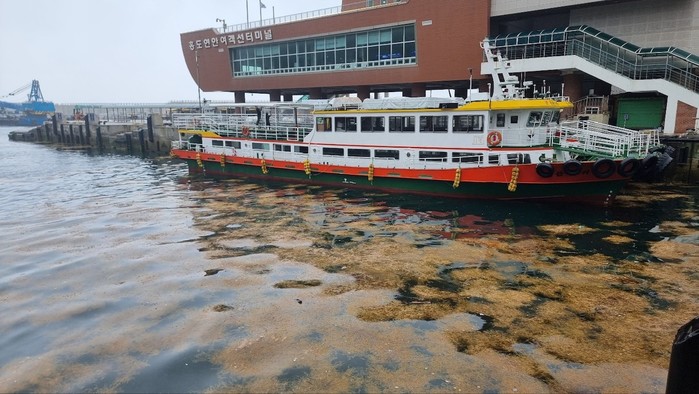 | ▲해역에 유입된 괭생이모자반/신안군 제공 |