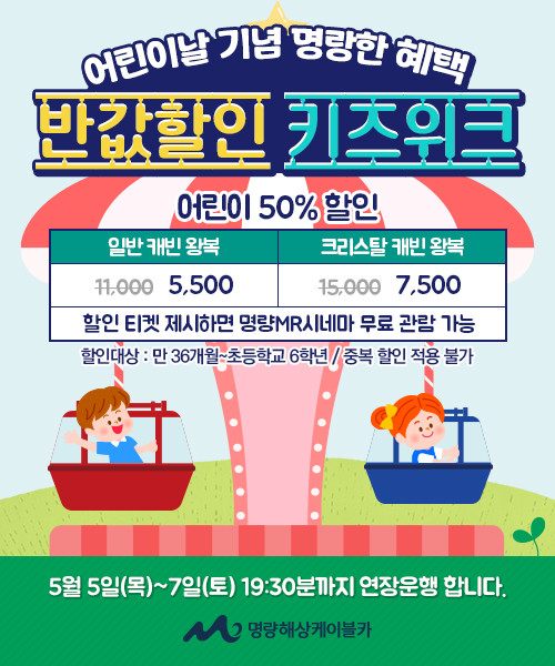 다가오는 5월 5일(목)부터 5월 8일(일)까지 중학생 이하 소인 발권 대상자의 경우 정상가에서 50% 할인된 가격으로 케이블카를 즐길 수 있을 뿐 아니라, 케이블카 티켓을 제시하면 진도 스테이션과 연결되어 있는 진도타워 4층 명량MR시네마 또한 무료로 관람할 수 있는 이벤트를 진행한다고 밝혔다.