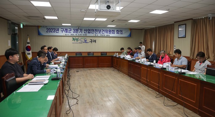 [전남=프레스뉴스] 강래성 기자= 전남 구례군은 10월 4일 군청 상황실에서 군 소속 종사자의 안전 및 보건에 관한 중요 사항을 심의 . 의결하기 위해 2023년 3분기 산업안전보건위원회 정기 회의를 개최했다고 밝혔다.