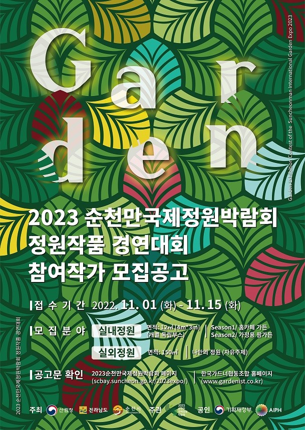 [광주=프레스뉴스] 강래성 기자=(재)순천만국제정원박람회조직위원회(사무총장 천제영)는 2023순천만국제정원박람회 기간 동안 열릴 AIPH(국제원예생산자협회) 정원작품 경연대회에서 수준 높은 정원 조성 기법을 선보일 국내외 우수한 작가를 공모한다.