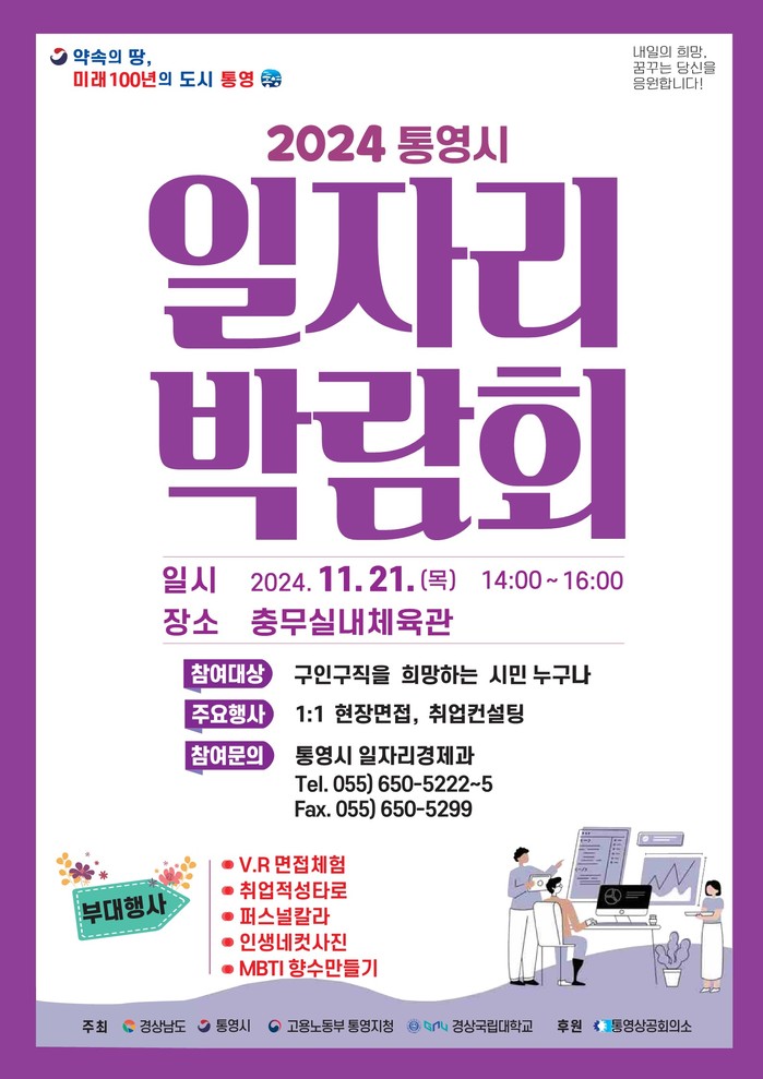 [프레스뉴스] 정재학 기자=통영시는 인력채용에 어려움을 겪는 기업에게 지역인재 채용 기회를, 구직자에게 취업 기회와 각종 일자리 정보를 제공하는 ‘2024년 통영시 일자리박람회’를 오는 21일(목) 오후2시 층무실내체육관에서 개최한다고 7일 밝혔다.