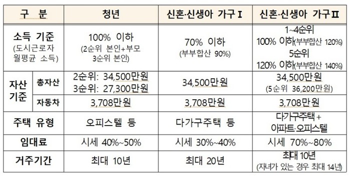 | ▲청년, 신혼·신생아 매입임대 소득·자산 기준.(제공=국토교통부) |