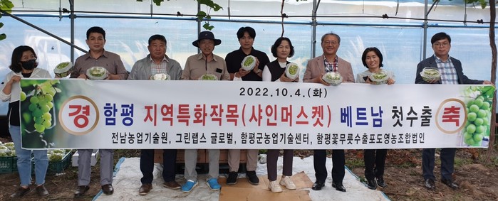 함평군은 5일 “함평 샤인머스켓 베트남 수출 상차식이 김도익 전남농업기술원 자원경영과장 및 군 관계자 등 10여 명이 참석한 가운데 해보면 광암리에서 열렸다”고 밝혔다.