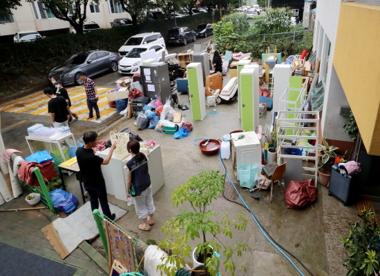 ▲지난 16일 충남 공주시 옥룡동에 위치한 한 요양시설에서 관계자들이 물에 잠긴 가전과 집기류를 건물 밖에서 정리하고 있다.(사진= 뉴스1) |