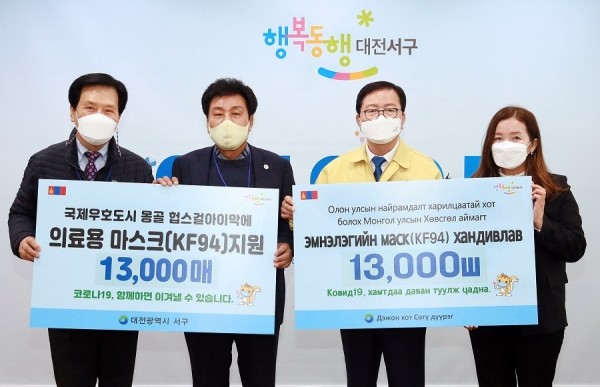 [프레스뉴스] 최정현 기자= 대전 서구는 최근 코로나19 확산으로 어려움을 겪고 있는 국제 우호 도시 몽골 헙스걸에 위로 서한과 함께 KF94 마스크 1만3000매를 전달했다.