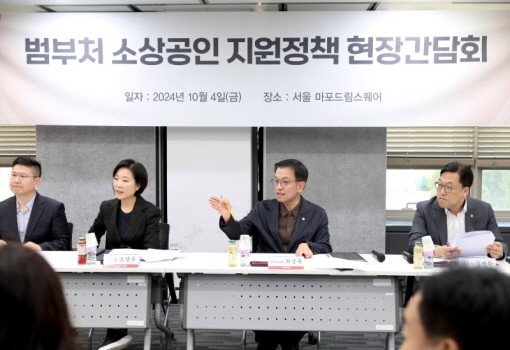 ▲최상목 부총리 겸 기획재정부 장관(가운데), 오영주 중소벤처기업부 장관(왼쪽), 김병환 금융위원장(오른쪽)이 4일 서울 마포구 소상공인시장진흥공단 서울지역본부에서 열린 ‘범부처 소상공인 지원정책 현장간담회’에서 실무자들과 소상공인·자영업자 지원정책 관련 논의를 하고 있다.(사진= 중소기업벤처부) |