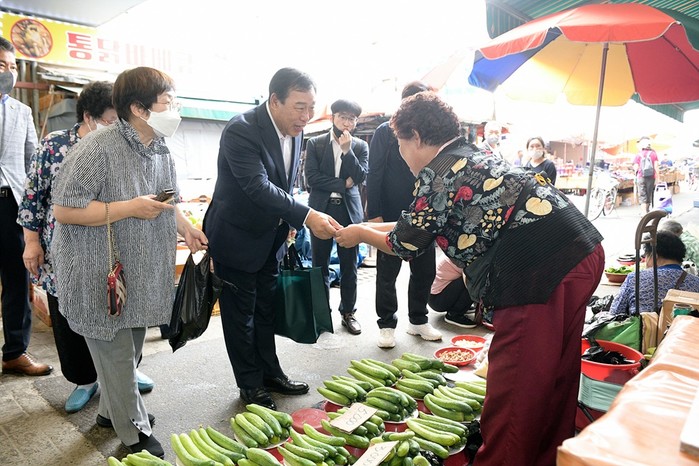 이날 최 시장은 판매되는 제수용품 등을 확인하고 물가상승에 따른 경기침체 등으로 어려움을 겪고 있는 상인들의 애로사항을 직접 경청하고 시 차원의 지원 방안을 논의했다.