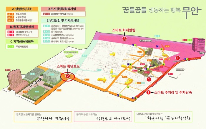 이번 공모에 선정된 무안읍 생활밀착형 도시재생 스마트기술 지원사업은 총 사업비 8억 3400만원(국비 5억원 포함)으로 ▲낙지골목 주차타워, 도시재생 주차장에 스마트 주차 서비스와 주차유도 시스템, 낙지특화거리에 불법 주·정차 단속 시스템, ▲무안읍 복합문화센터 앞 도시재생 보행(통학)로에 스마트 횡단보도 시스템, ▲중앙로, 낙지골목 일원에 스마트 화재알림 서비스 등을 추진할 계획이다.