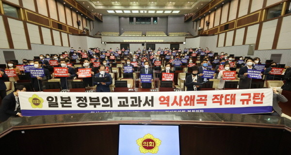 일본 후쿠시마 방사성 오염수 방류문제에 우리의 관심이 쏠린 가운데 사실상 완결판에 해당하는 이번 일본의 역사 왜곡 교과서 채택의 위험성에 대해 지방의회 차원의 규탄 결의안을 채택한 곳은 경기도의회가 유일하다.