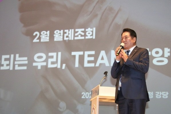 [프레스뉴스] 장현준 기자= 최대호 안양시장이 1일 오전 9시 안양시청 강당에서 열린 월례 조회에서 ‘결속력(팀워크)’을 주제로 직원 대상 강연을 펼쳤다.
