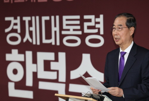 ▲한덕수 무소속 대선 예비후보가 7일 서울 여의도 맨하탄21빌딩에 마련된 선거 사무소에서 긴급 입장 발표를 하고 있다.(사진= 뉴스1) |