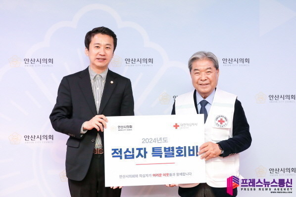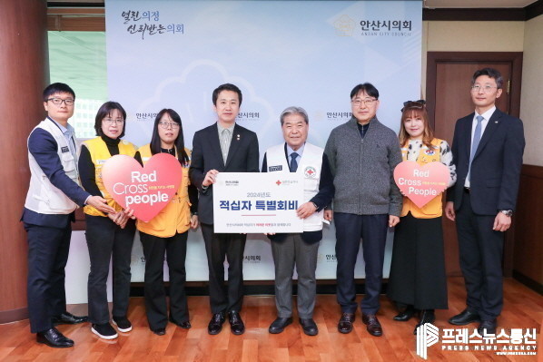 [프레스뉴스] 김대일 기자= 안산시의회(의장 송바우나)가 9일 의장실에서 2024년 적십자 특별회비 전달식을 갖고 대한적십자사 경기도지사에 특별회비 100만원을 전달했다.