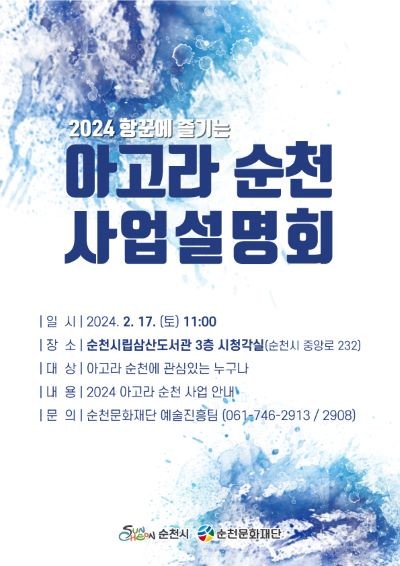 [전남=프레스뉴스] 강래성 기자= 순천문화재단(이사장 노관규)은 오는 17일 11시, 순천시립삼산도서관 3층 시청각실에서 지역예술인과 일반 시민을 대상으로 ‘2024 항꾼에 즐기는 아고라 순천’ 사업설명회를 개최한다고 밝혔다.