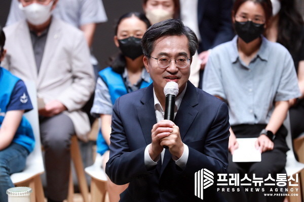 | ▲ 김동연 경기도지사가 15일 오전 경기도 수원시 영통구 경기도청 대강당에서 현장에서 만났던 다양한 지역민, 우수 정책제안자, 31개 시군 대표와 일반 도민 등과 함께 ‘기회수도 경기’를 주제로 맞손토크를 하고 있다.(사진=경기도) |