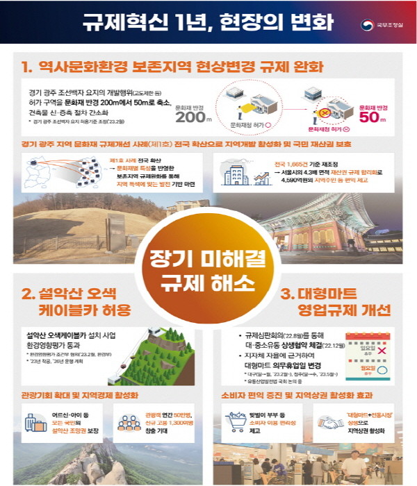문화재청이 문화재 보존지역에 따른 주거·상업·공업지역의 개발행위 제한 범위를 기존 500m에서 200m 이내로 변경한 것도 규제개선 사례로 제시됐다.