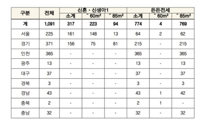 이번 첫 입주자 모집은 월세형(신혼·신생아 매입임대) 317호, 든든전세(전세형) 774호로 모두 1091호 규모다.