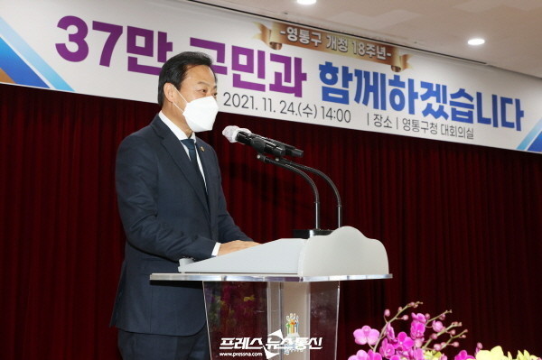장현국 의장은 이날 인사말을 통해 “영통구는 삼성전자, SDI, 중소기업 종합지원센터, 광교테크노밸리가 소재한 IT산업의 메카이자, 수원고법.고검, 수원컴벤션센터가 있는 경기도의 거점으로 내년에는 경기도의회와 경기도 신청사가 영통구로 이전하는 만큼 지속적 발전이 기대된다”며 “영통구 매탄동을 지역구로 둔 도의원이자 경기도의회 의장으로서 더 행복하고 희망찬 영통구의 미래를 응원하겠다”고 전했다.
