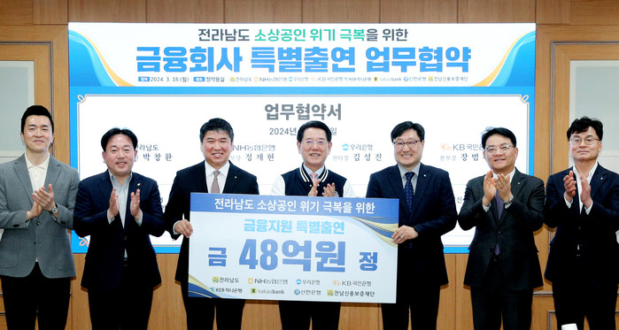 [전남=프레스뉴스] 강래성 기자= 전라남도는 소상공인 금융지원을 통한 경영위기 극복을 위해 18일 도청에서 전남신용보증재단, 농협·우리·국민·하나·신한·카카오뱅크 6개 금융회사와 48억 원 특별출연 협약을 했다. 이로써 총 출연금은 63억으로 늘었다.