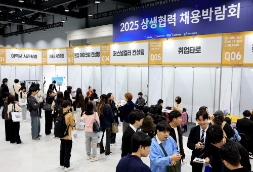 | ▲21일 서울 강서구 코엑스 마곡에서 열린 '2025 상생협력 채용박람회'를 찾은 구직자들이 행사부스를 살펴보고 있다.(사진= 뉴스1) |
