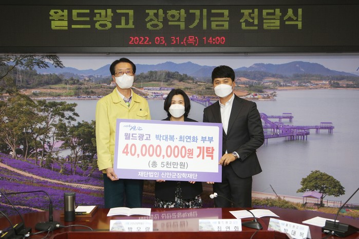 [전남=프레스뉴스] 강래성 기자= 월드광고 박대복‧최연화 부부는 3월 31일 신안군청을 방문해 어려운 환경에서 학업에 정진하는 학생들을 위해 사용해 달라며 신안군장학재단에 4천만원의 장학기금을 약정했다.