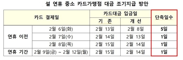 카드가맹점 대금도 선지급된다. 카드업계는 중소 카드가맹점에 대해 가맹점 대금을 최대 5일 먼저 지급한다.