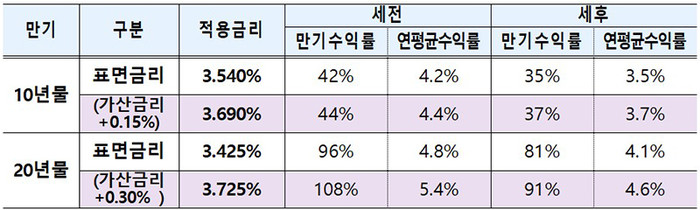 표면금리는 전월 발행한 동일 연물 국고채 낙찰금리(10년물 3.540%, 20년물 3.425%)를 적용하며 가산금리는 최근 시장상황 등을 고려해 10년물은 0.15%, 20년물은 0.30%를 적용할 예정이다.