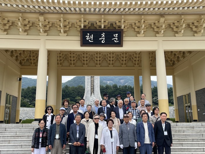 ▲광주시교육청학생독립운동기념회관은 13일 사단법인 광주학생독립운동동지회 회원 40여명과 함께 국립대전현충원 현충탑 앞에서 참배를 드리고 기념사진을 찍고 있다./광주교육청 제공 |