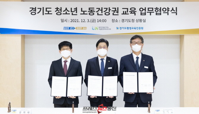 경기도는 3일 경기도청에서 일터건강을 지키는 직업환경의학과 의사회(이하 직업환경의사회), 경기도평생교육진흥원과 이런 내용을 담은 ‘경기도 청소년 노동건강권 교육’ 업무협약을 체결했다. 협약식에는 오병권 경기도지사 권한대행, 강희태 직업환경의사회장, 김제선 경기도평생교육진흥원장 등이 참석했다.